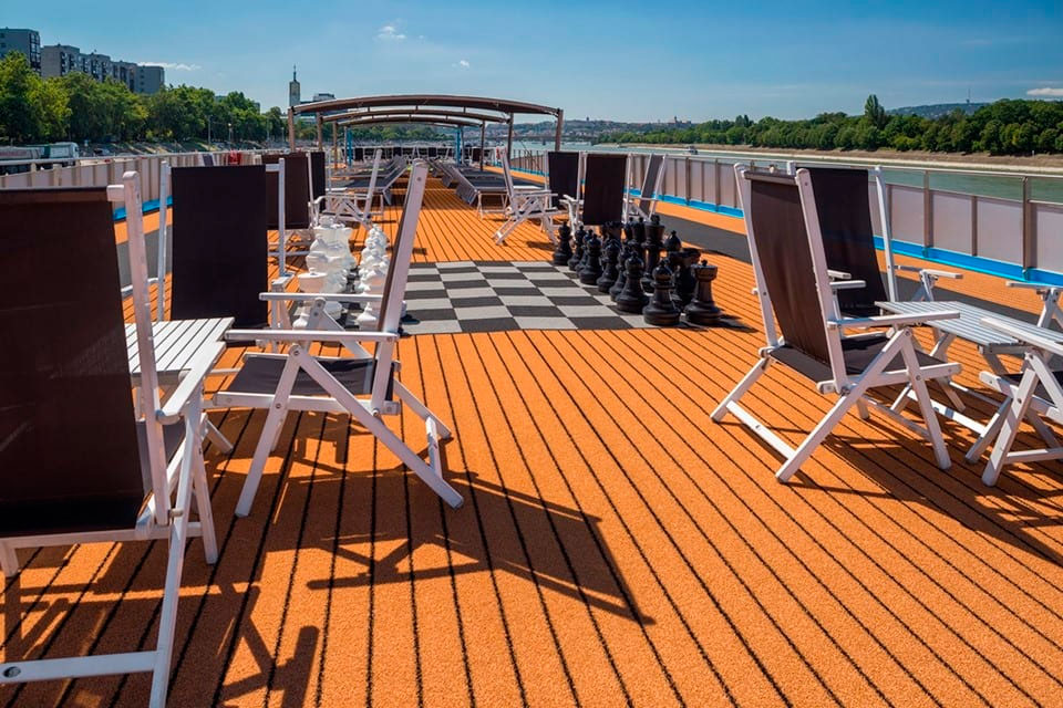 Disfrute de la bañera de hidromasaje en la cubierta de sol mientras pasamos por castillos centenarios, pueblos encantadores y otros paisajes impresionantes.
