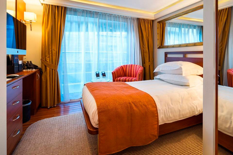 Control de temperatura en la habitación. Habitación de lujo de estilo hotel con ropa de cama egipcia, almohadas y edredón de plumas. Amplios baños con duchas de chorros múltiples. Armario grande, espejo de cuerpo entero, secador de pelo, caja fuerte y teléfono directo. Televisor de pantalla plana que también funciona como ordenador. Sistema de entretenimiento a pedido que ofrece TV, películas y música de cortesía. Internet y Wi-Fi de cortesía. Agua embotellada de cortesía repuesta diariamente. Escritorio y silla