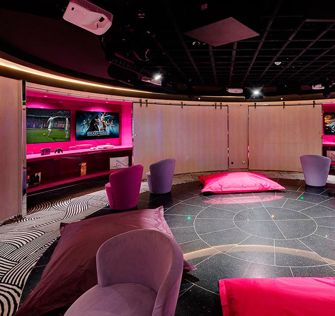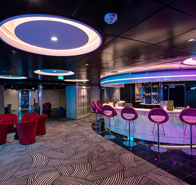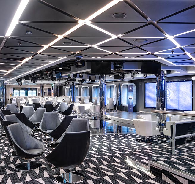 Este espacio multi-funcional albergará una emisora de radio y un estudio de televisión donde se podrá participar en juegos de preguntas, concursos de talentos y otras divertidas actividades a lo largo del crucero. Este salón, contará además con un Comedy Club, un Karaoke Bar y espectáculos de música en directo.